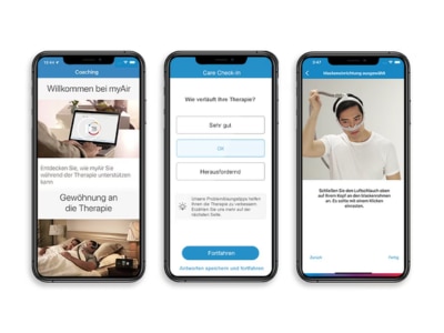 Die myAir-App ermöglicht Ihnen, aktiv Ihre Therapie zu gestalten, indem Sie Ihre Therapiequalität verfolgen und angebotene Selbsthilfeoptionen nutzen. Wie Sie die App bei Ihrer Therapie unterstützt, erfahren Sie hier: